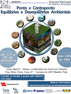 A Semana Nacional de Ciência e Tecnologia de 2011 tem como tema “Mudanças climáticas, desastres naturais e prevenção de risco”. Dentro desta proposta, a Casa da Ciência do Hemocentro de Ribeirão Preto, apresenta a exposição “Ponto e contraponto: equilíbrios e desequilíbrios ambientais”. A partir de espaços experimentais monitorados, os visitantes investigarão aspectos da biodiversidade terrestre e aquática. Com ênfase na forma e função de estruturas dos seres vivos – como as corbículas das abelhas e os ovos de resistência dos cladóceros – os estudantes identificarão as relações do organismo e o ambiente, explorando as guildas tróficas, a microfauna de plantas aquáticas e as variáveis climáticas responsáveis pela homeostase ambiental.A Semana Nacional de Ciência e Tecnologia é um evento promovido desde 2004 pelo Ministério da Ciência, Tecnologia e Inovação com o objetivo de mobilizar a população, em especial crianças e jovens, valorizando a criatividade, a atitude científica e a inovação.